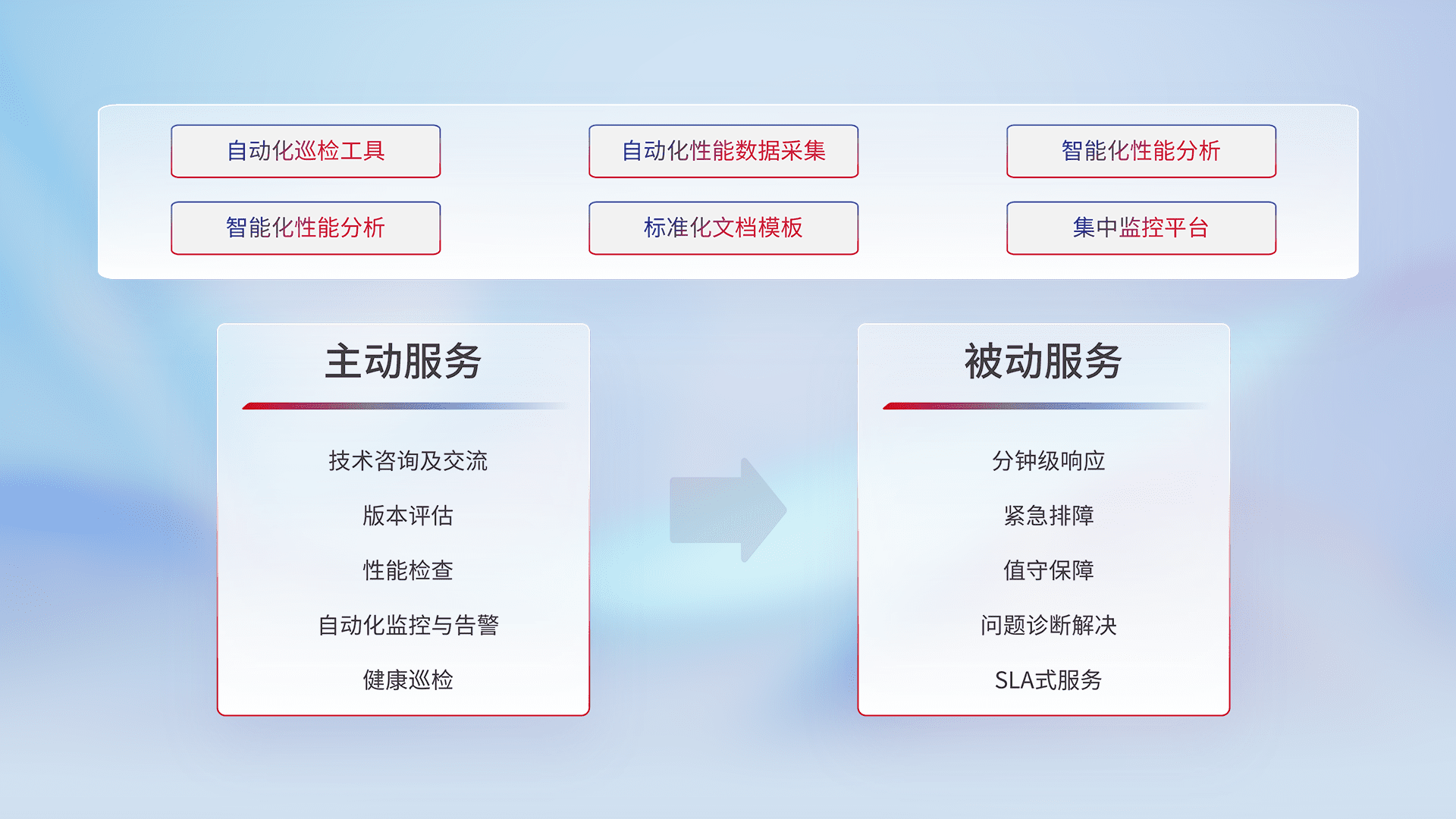 智能化工具和标准化文档,,保障服务质量,,提供主动服务(包含技术咨询、、版本评估、、、性能检查、、自动化监控与告警、、健康巡检)和被动服务包含(分钟级响应、、、、紧急排障、、、、值守保障、、问题诊断解决、、、SLA服务)。。